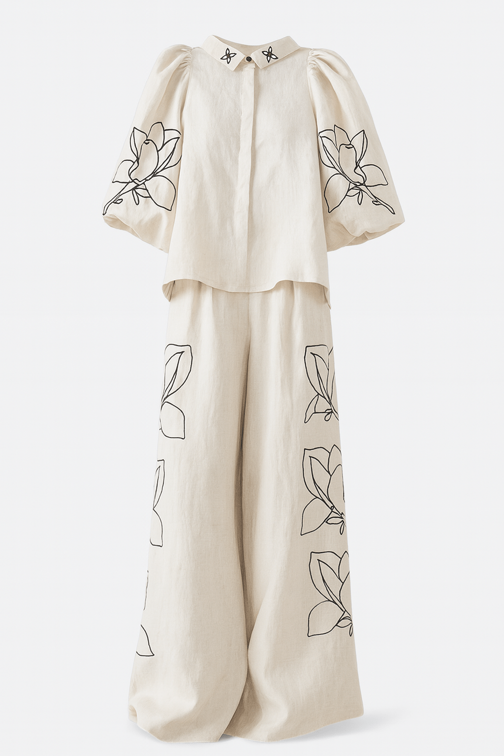 Helen-setti spojuje přirozené pohodlí a aktuální eleganci. Svetr s balónovými rukávy a široké kalhoty z bavlněno-lenové směsi vytvářejí lehký a vzdušný siluetu, která je ideální pro teplé dny. Květinový vzor přináší svěžest a moderní vzhled, což z tohoto outfitu činí univerzální volbu jak pro volné chvíle, tak pro příležitosti, kde oceníte nádech zvláštního stylu.
