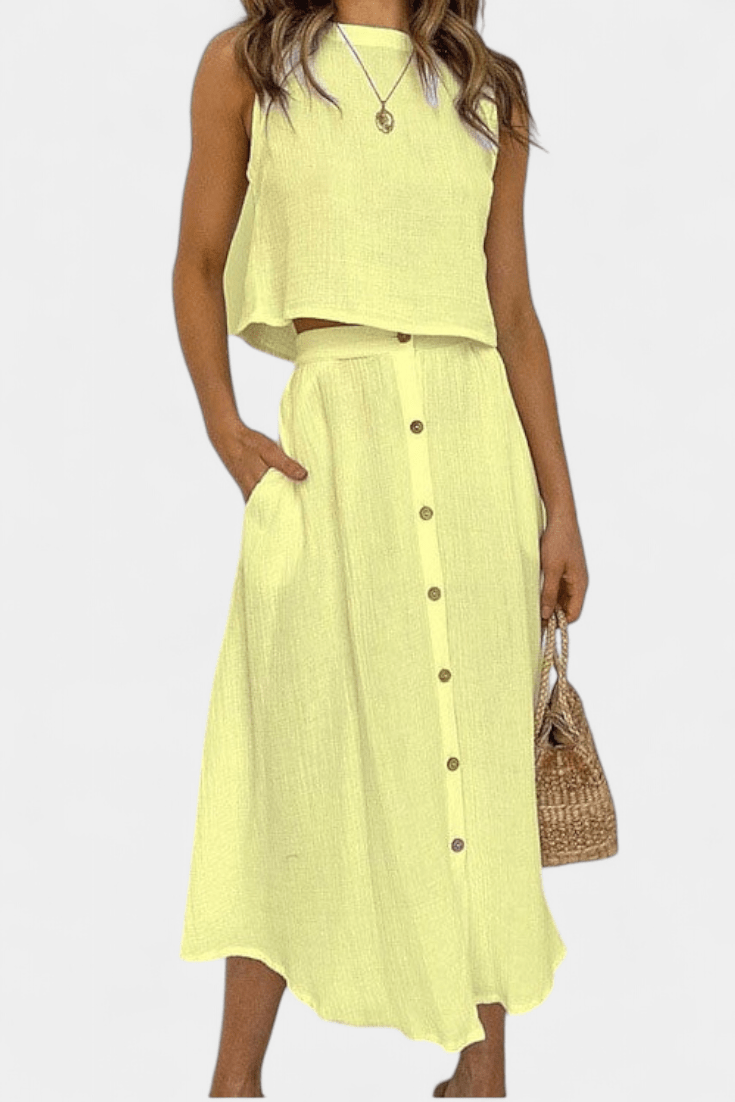 Multifunkční sada inspirovaná minimalistickým stylem, která vyzařuje svěžest, pohodlí a uvolněný styl. Lehký pocit bavlny, vzdušný střih a dekorativní knoflíky z ní dělají ideální volbu pro pohodový den nebo okouzlující městskou dovolenou s přirozeným nádechem.