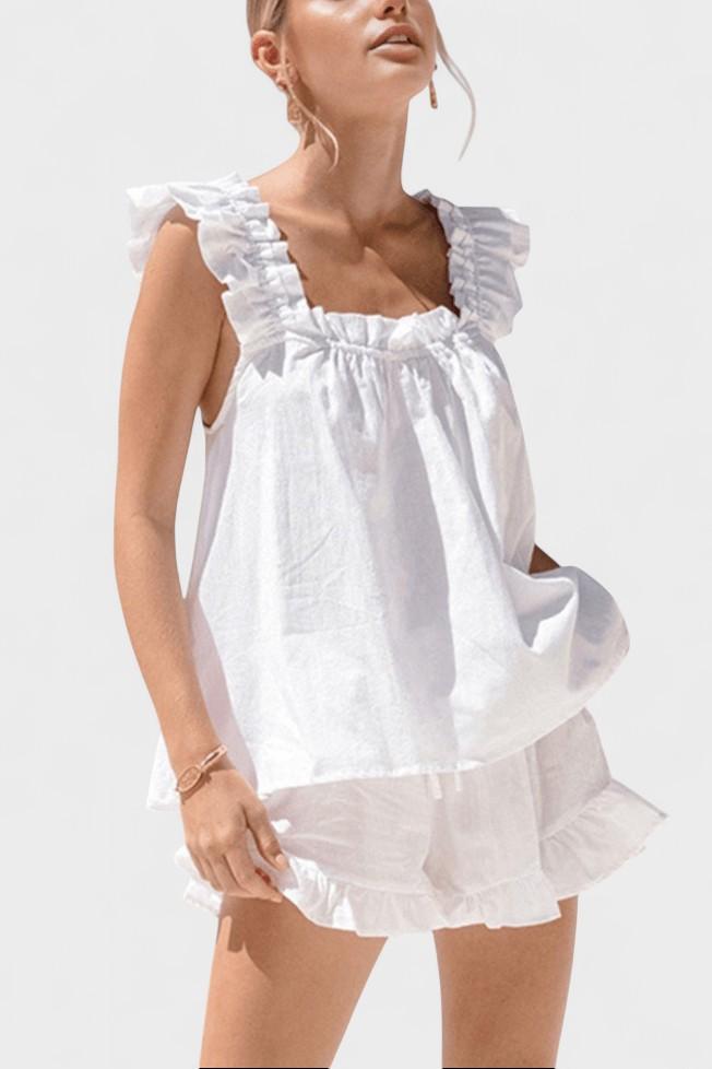 Victoria-setti je definice uvolňujícího kouzla. Je navržen pro teplé dny, kdy se pohodlí setkává se stylem. Tento set spojuje volánkový top bez rukávů a odpovídající šortky, čímž vytváří svěží a ženský vzhled. Ideální pro relaxaci, procházky nebo jednoduše pro vychutnání si okamžiku v lehkosti.