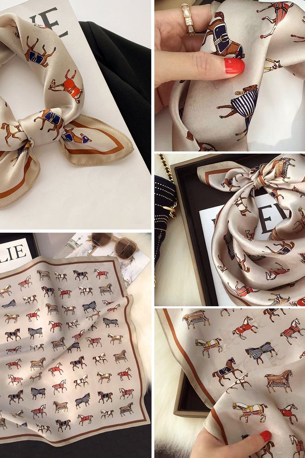 Přidejte svému stylu šmrnc s tímto elegantním 100 % čistým hedvábím dámským šátkem. Luxusně měkký a lesklý povrch spolu s elegantními koňskými vzory dělá z tohoto doplňku sofistikovanou a stylovou volbu.