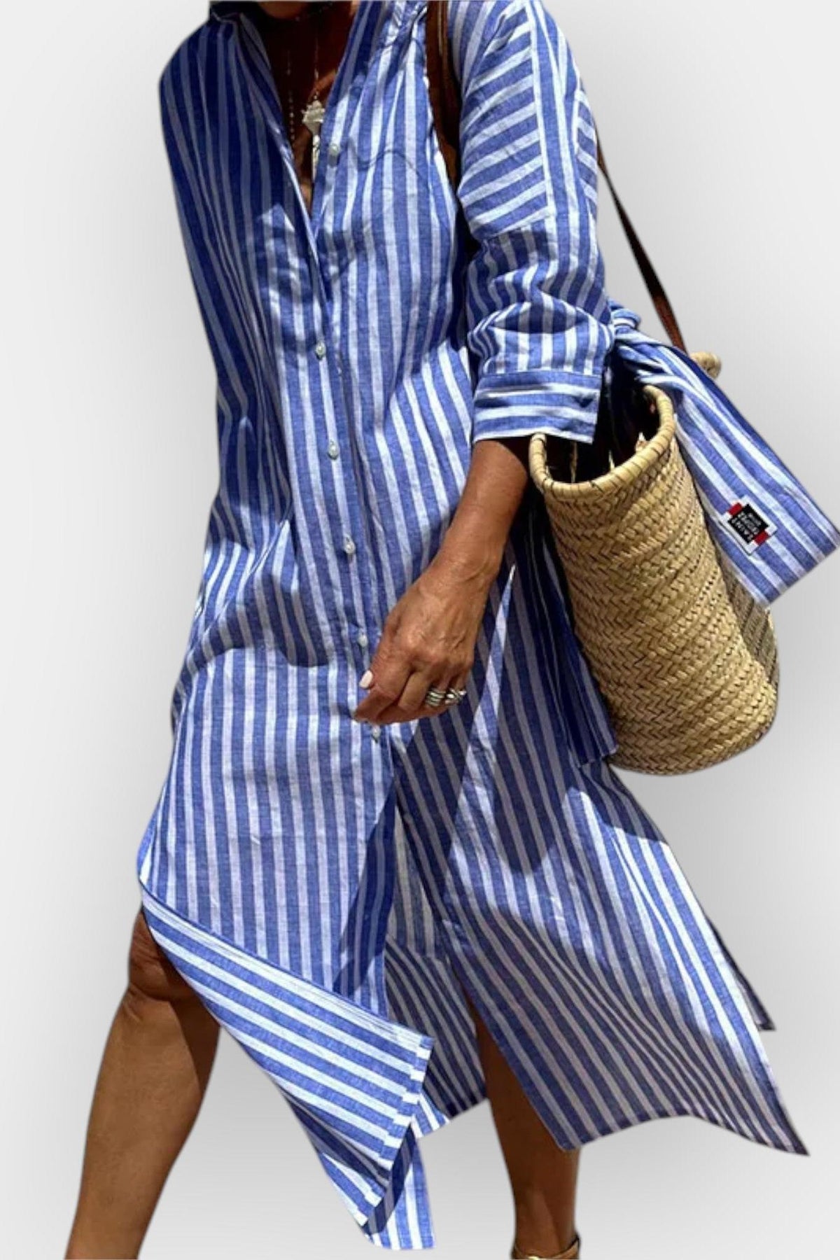 Klasické, ale moderní, tyto pruhované šaty košilového střihu dokonale spojují pohodlí a styl. Ideální volba na teplé dny – styl se přizpůsobí každé situaci.