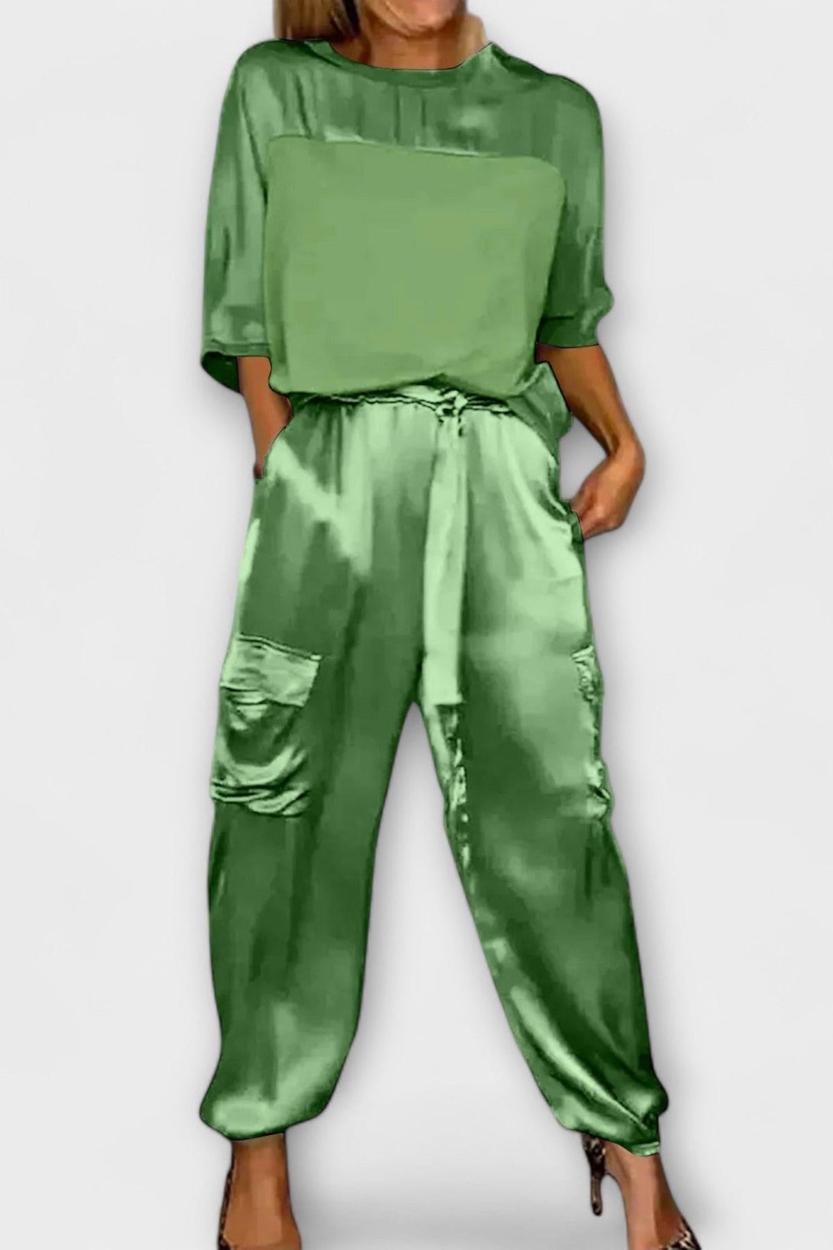 Zažijte prvotřídní pohodlí a sofistikovaný vzhled v naší luxusní dvoudílné hedvábné soupravě. Lehký a prodyšný materiál se cítí jemně na pokožce a moderní střih zajišťuje vždy upravený vzhled – ať už jste doma, v práci nebo na večírku. Tato souprava spojuje eleganci a praktičnost, což činí každý okamžik výjimečným.
