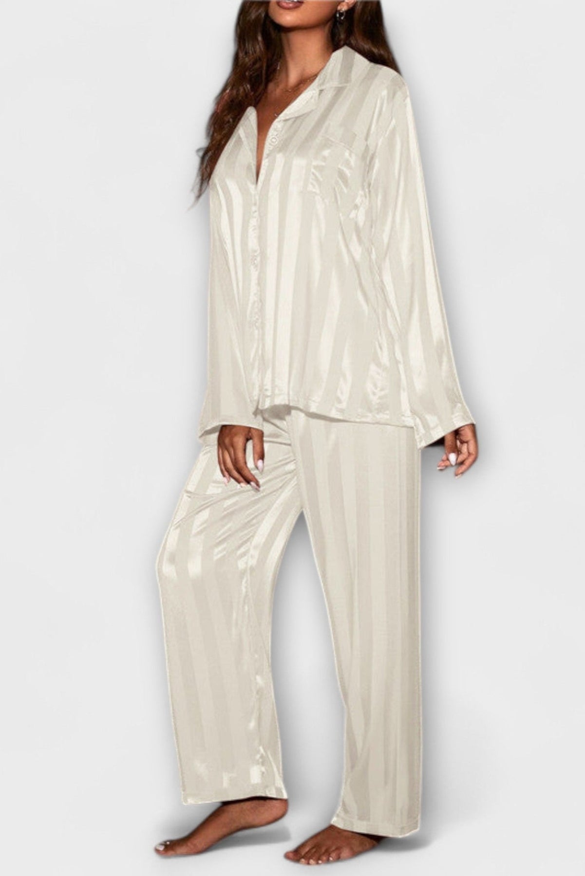Tento dlouhý saténový pyžamo je dokonalou kombinací luxusu a pohodlí. Saténový povrch a klasický střih se příjemně dotýkají pokožky a zároveň přinášejí sofistikovaný vzhled – i během spánku. Ideální pro všechny, kteří chtějí být stylově oblečeni i ve chvílích odpočinku.