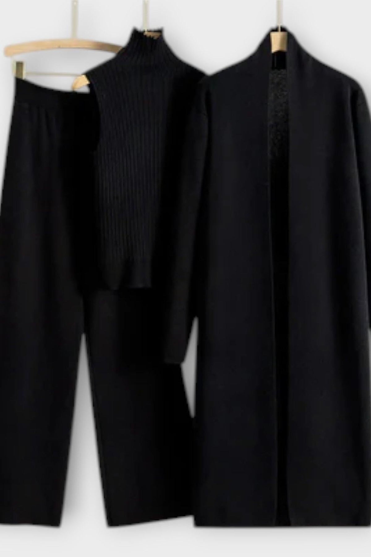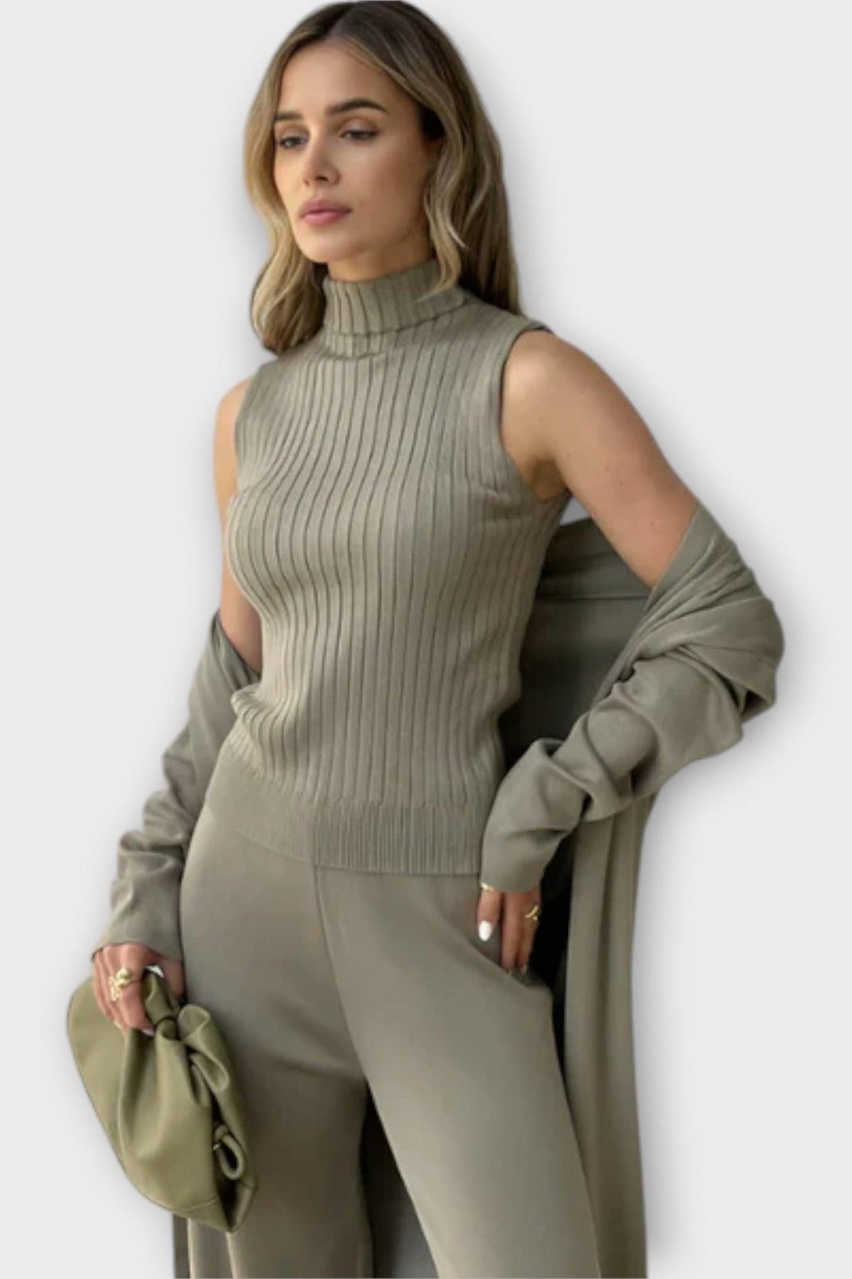 Tento set vyrobený z ribového úpletu přináší svěží a moderní vzhled do chladnějších dnů. Set obsahuje kalhoty s rovnými nohavicemi, bezrukávový top s vysokým límcem a dlouhý, bez knoflíků kabát – kombinace, která nabízí jak eleganci, tak pohodlí. Ideální pro všestranné outfitové kombinace; hodí se jak do domácí kanceláře, tak na volnočasové aktivity, vždy přinášející nádech šarmu.